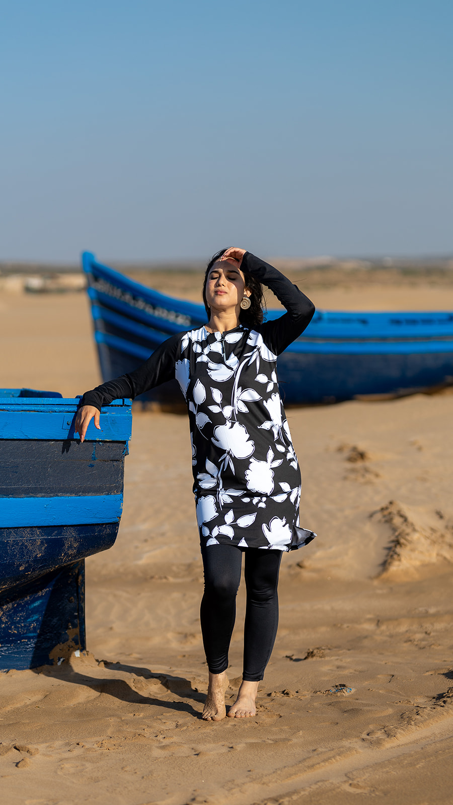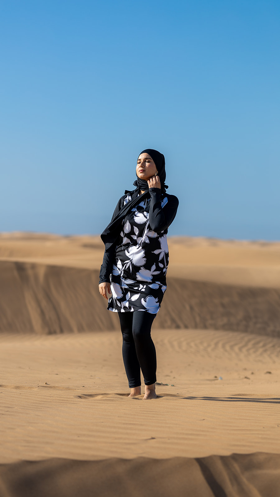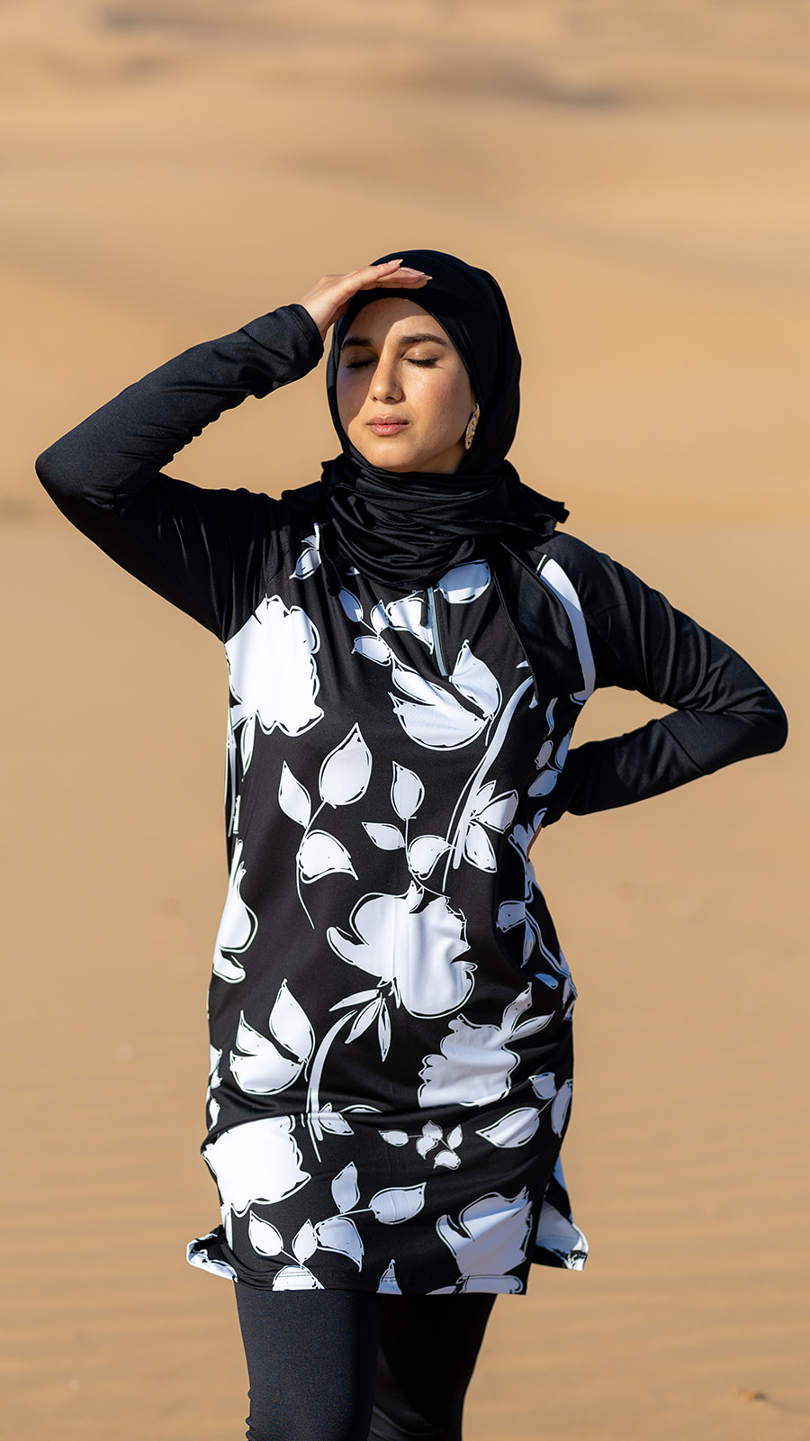 Ce burkini séduit par son élégance classique et son imprimé floral en noir et blanc. Le contraste puissant des motifs floraux sur fond sombre crée un look à la fois raffiné et affirmé, parfait pour celles qui veulent allier modestie et style.