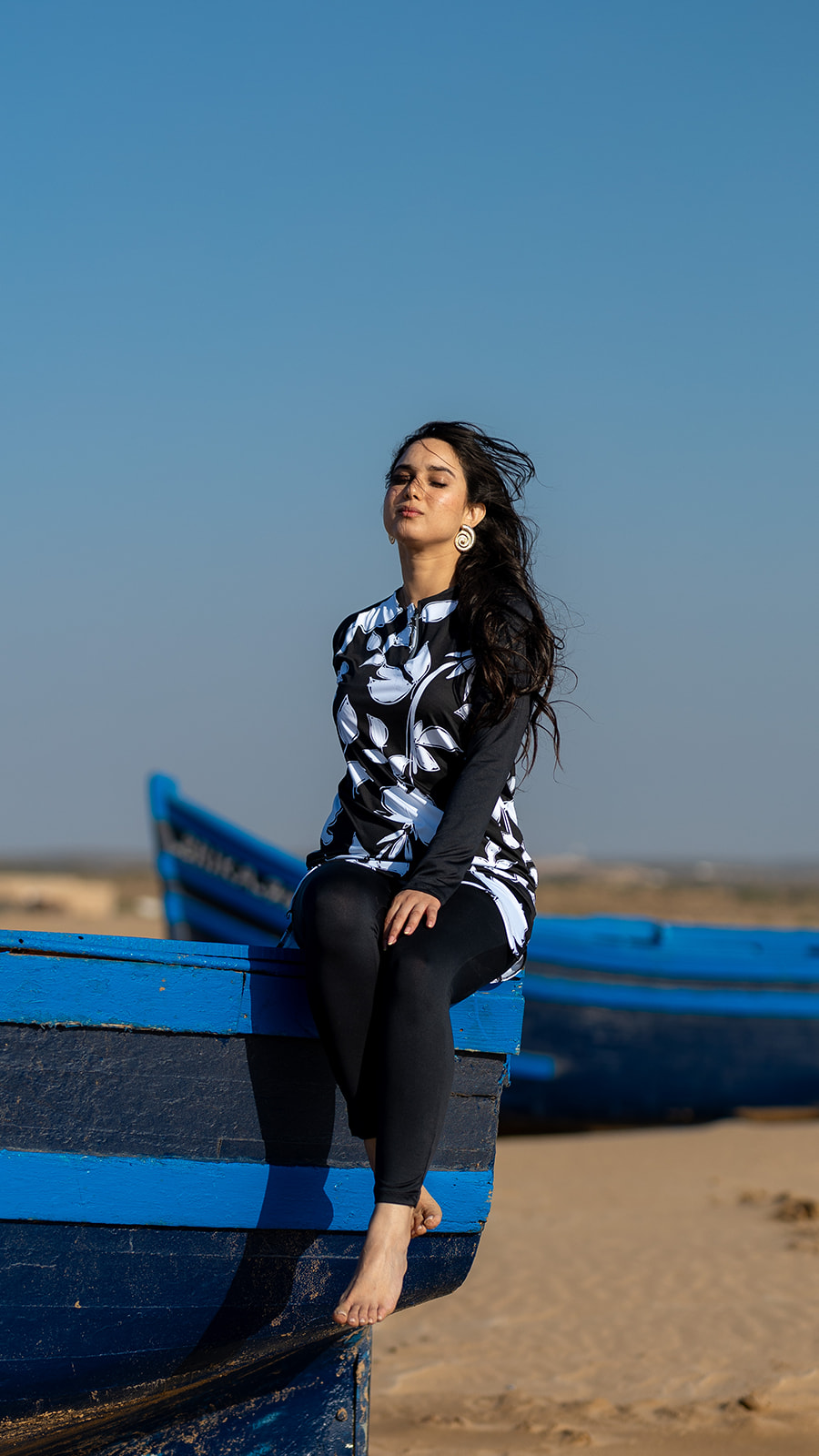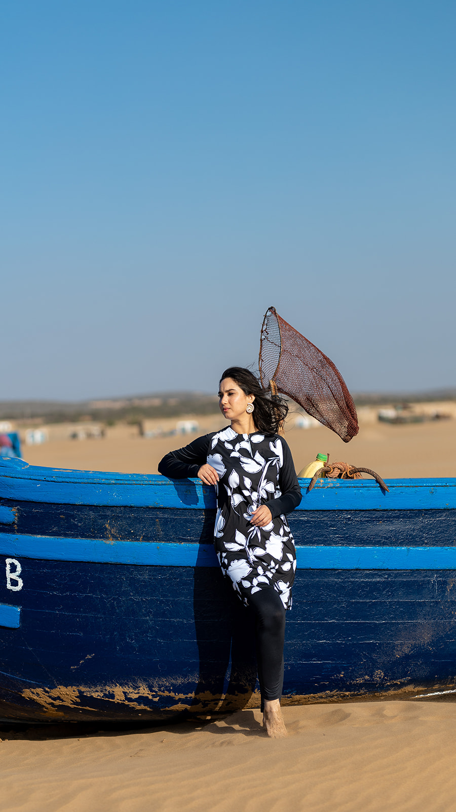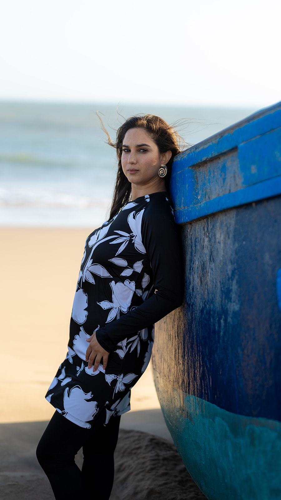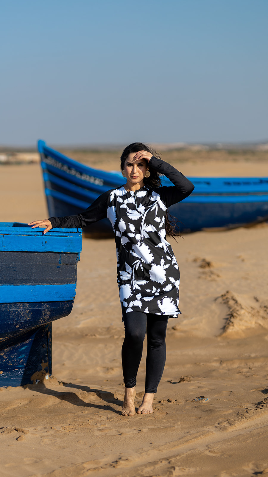 Ce burkini séduit par son élégance classique et son imprimé floral en noir et blanc. Le contraste puissant des motifs floraux sur fond sombre crée un look à la fois raffiné et affirmé, parfait pour celles qui veulent allier modestie et style.